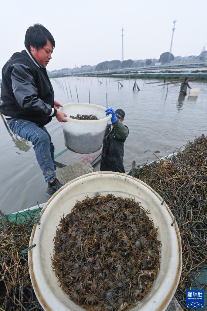 2月8日,在位于湖州市織里鎮的湖州湖星生態農業有限公司的太湖蟹養殖塘內,工作人員打撈太湖蟹苗。