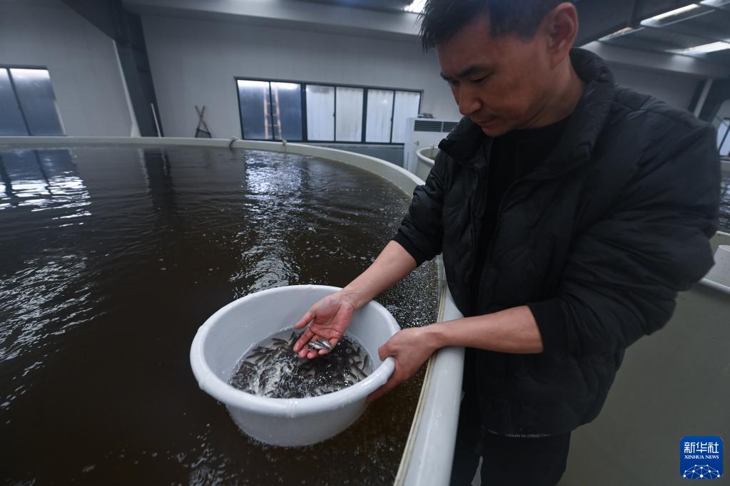 2月8日,在位于湖州市織里鎮的漁大哥水產養殖專業合作社育苗室內,工作人員查看鱸魚苗的長勢。