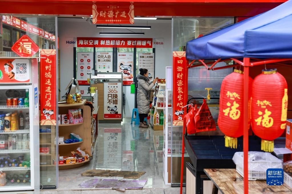 團結(jié)村村民趙荷花在自家經(jīng)營的超市內(nèi)擺放貨物(2月2日攝)。