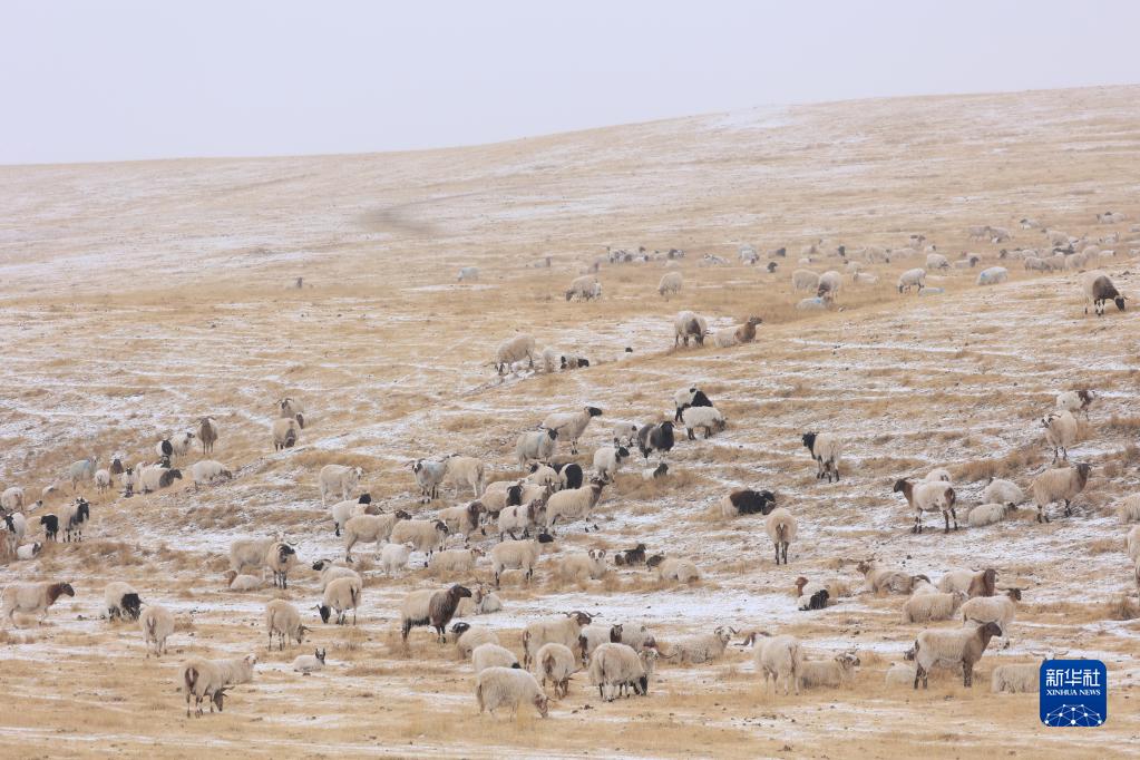 2月8日,在祁連山北麓的甘肅山丹馬場,羊群在雪中覓食。