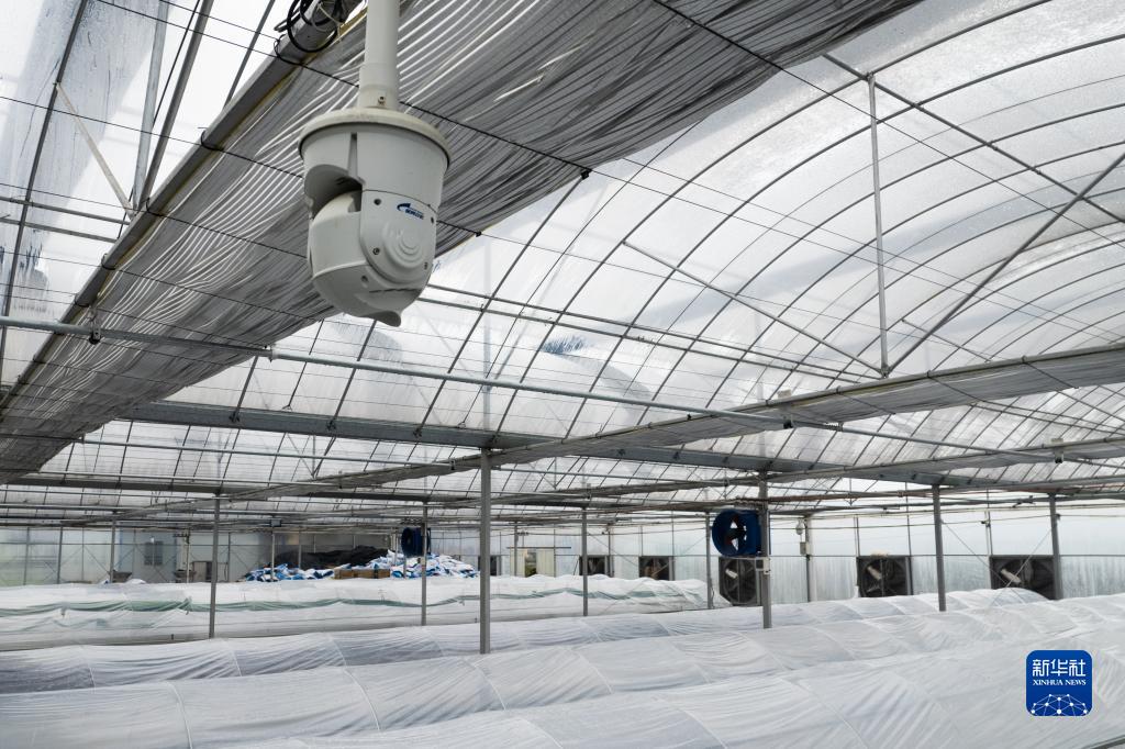 2月8日,在鼎城區國家現代農業產業園一處蔬菜育苗基地,智能攝像設備在記錄蔬菜生長情況(無人機照片)。