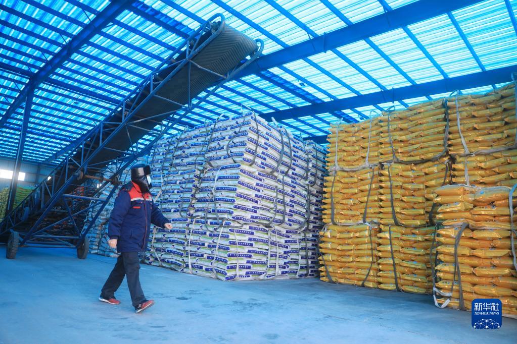 2月6日,在鐵嶺縣愛(ài)爾法農(nóng)業(yè)科技(遼寧)有限公司倉(cāng)庫(kù),工人在查看化肥儲(chǔ)存情況。