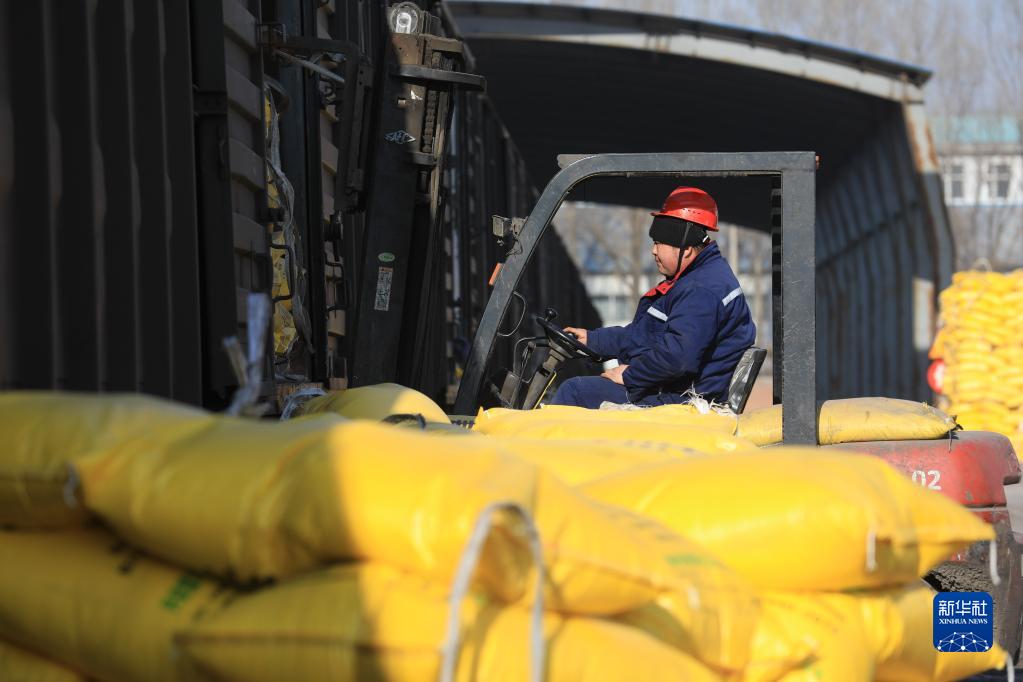 2月6日,在鐵嶺縣新臺子站,工人從火車上卸下化肥生產(chǎn)原料。