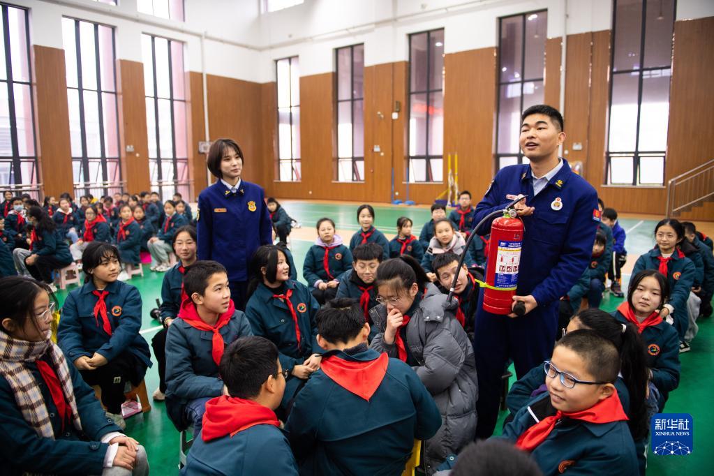 2月8日,在常德市武陵區第一小學體育館,消防隊員指導學生使用滅火器。