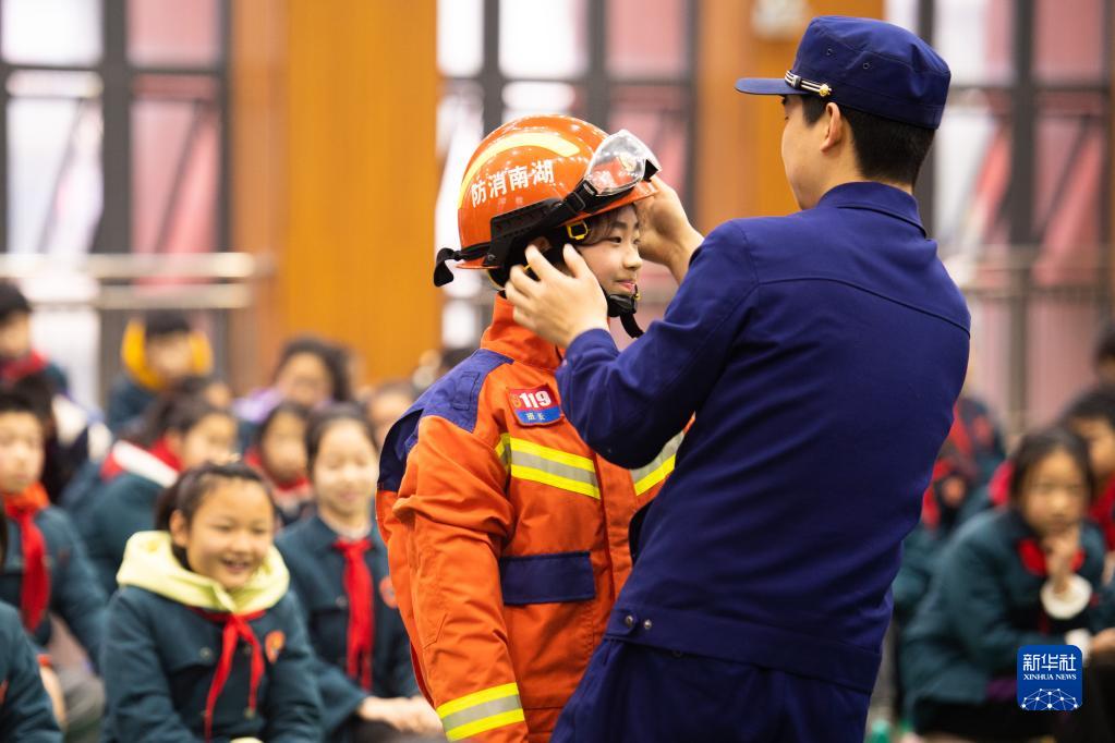 2月8日,在常德市武陵區(qū)第一小學體育館,學生體驗穿著消防救援服。
