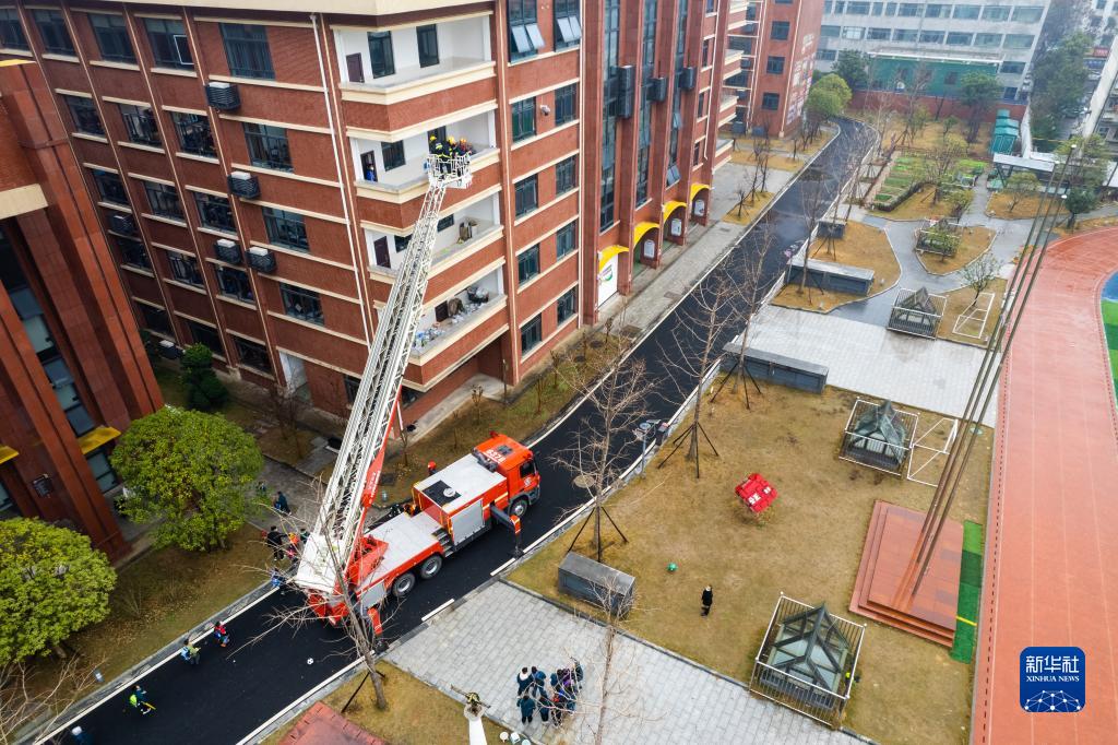 2月8日,在常德市武陵區(qū)第一小學(xué)教學(xué)樓,消防隊(duì)員在進(jìn)行高空營(yíng)救被困學(xué)生演練(無(wú)人機(jī)照片)。