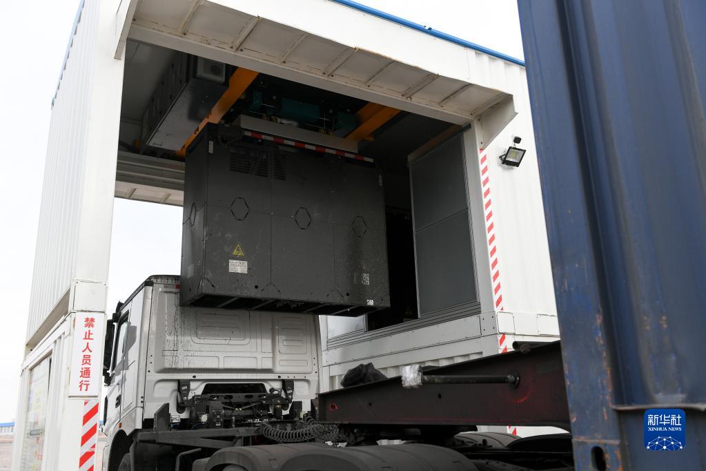 2月8日,在鄂爾多斯市東勝區綠動萬利新能源智慧陸港,新能源重卡進行全自動換電。