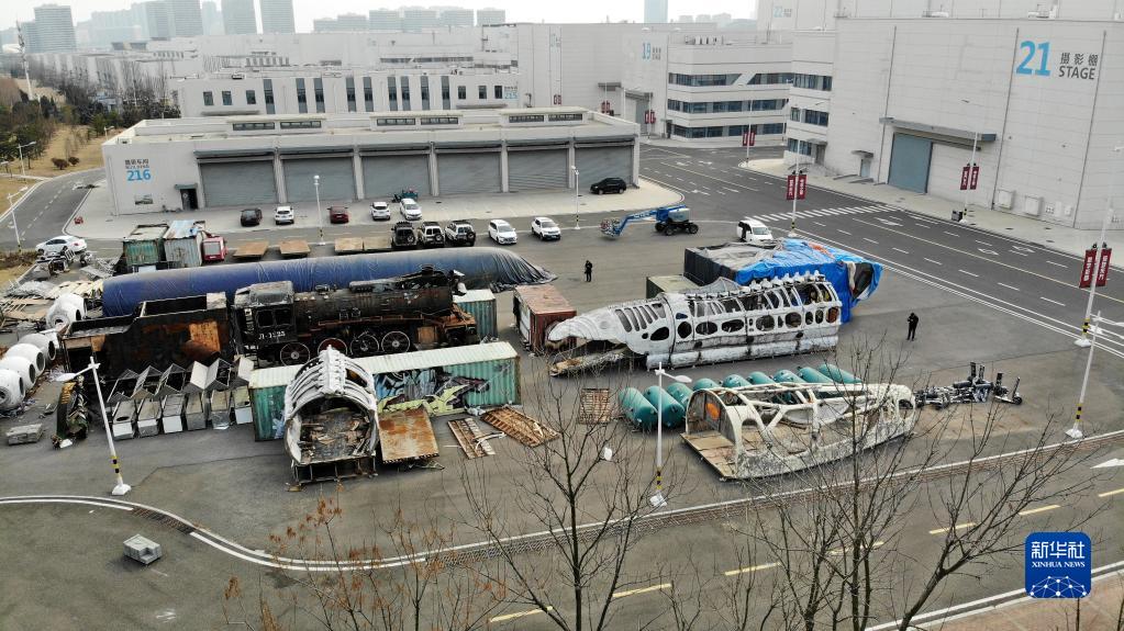 青島東方影都影視產(chǎn)業(yè)園置景車間外堆放的部分影視道具(2月8日攝,無人機照片)。