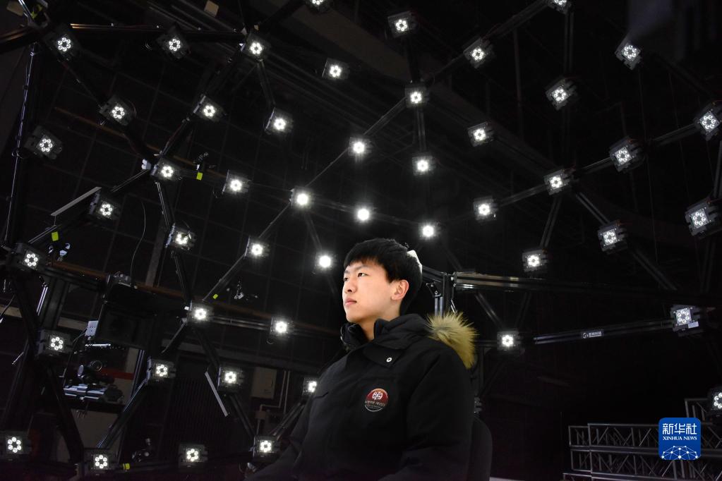 2月8日,青島東方影都影視產業園一名工作人員在演示微表情捕捉技術。