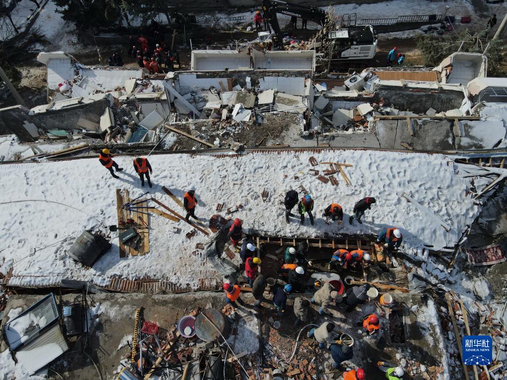 2月8日,在土耳其阿德亞曼省貝斯尼,救援人員在地震廢墟搜救(無人機照片)。