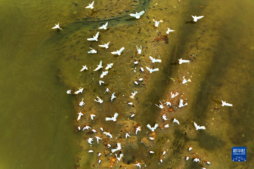 近日,在山東省青島市城陽區流亭街道墨水河入海口濕地,各種水鳥或趕潮覓食或翩躚飛翔,繪就一幅美麗的生態畫卷。