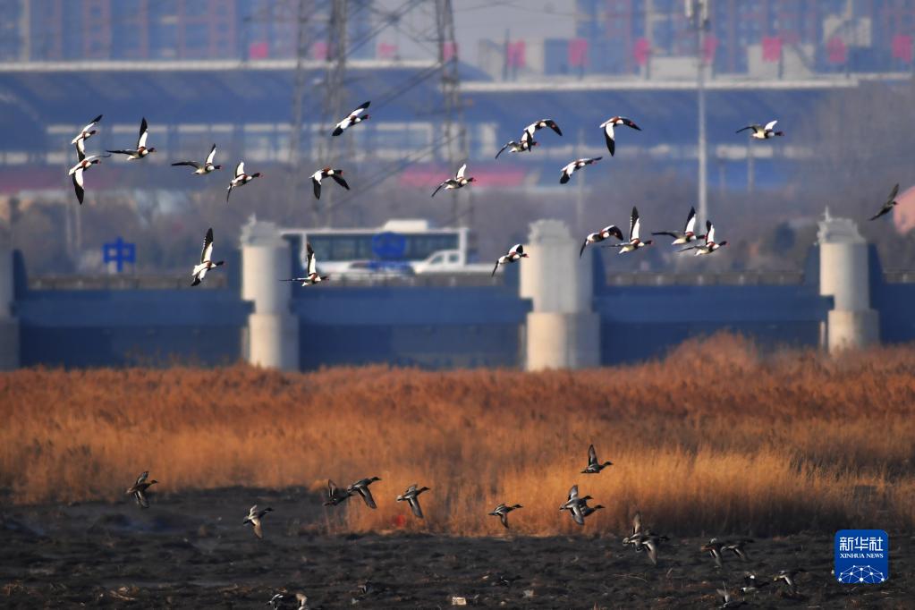 2月8日,在山東省青島市城陽區(qū)流亭街道墨水河入海口濕地,成群水鳥翩躚飛翔。
