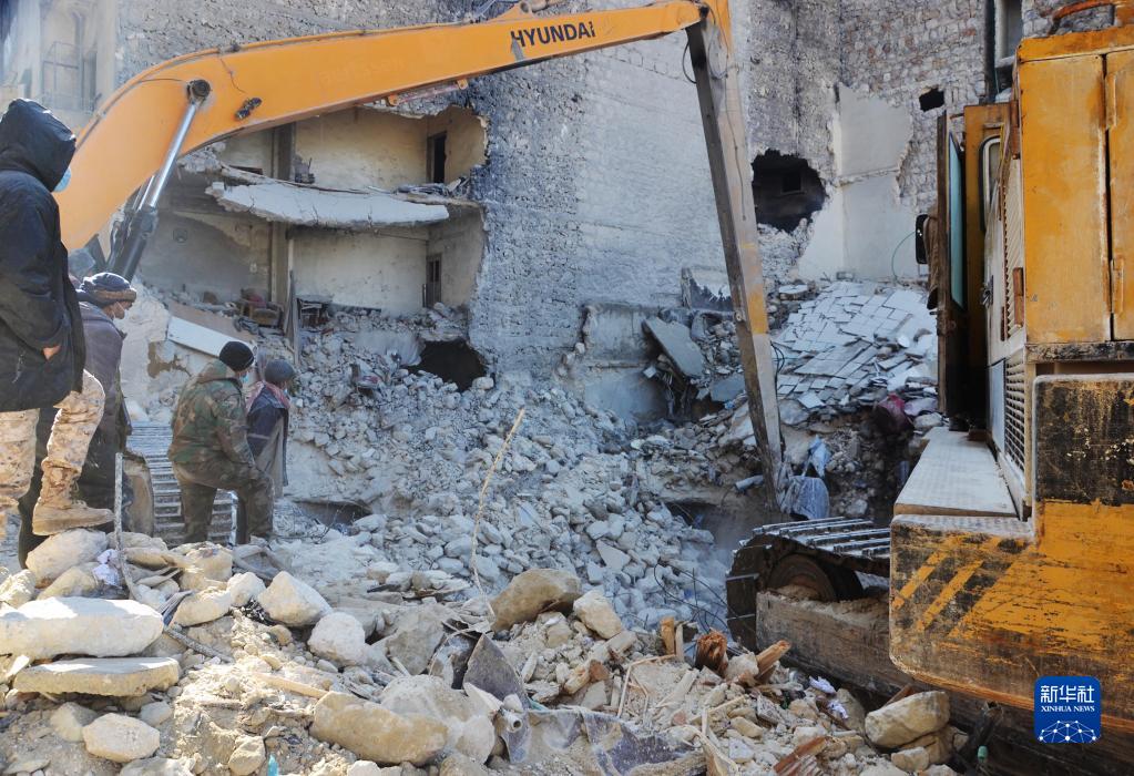 2月8日,救援人員在敘利亞阿勒頗的一處地震廢墟搜救。