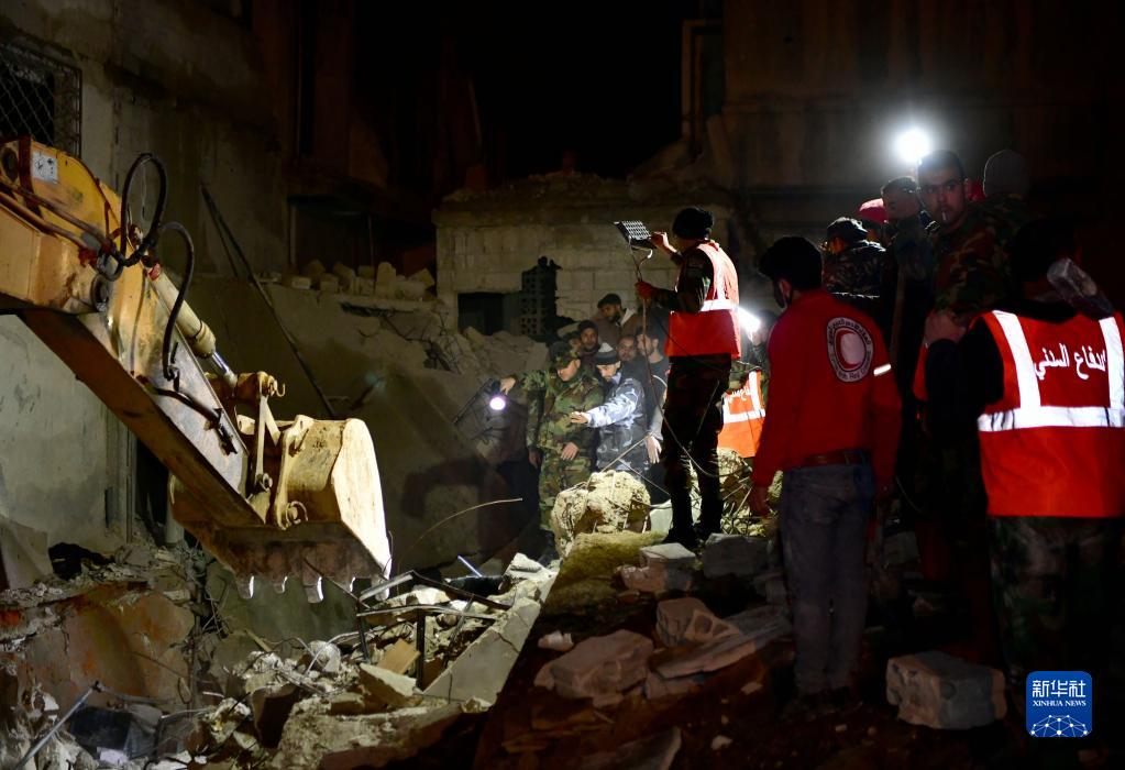 2月8日,救援人員在敘利亞大馬士革的一處地震廢墟搜救。