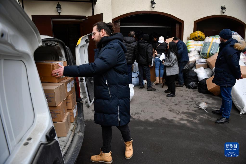 2月8日,在位于莫斯科的敘利亞駐俄羅斯大使館,一名男子將救援物資裝車。