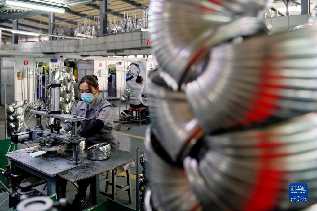 2月6日,在位于河北省沙河市的河北九月廚具股份有限公司,工人在生產線上工作。