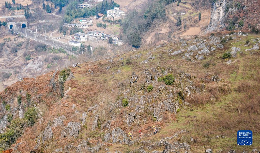 滬昆鐵路貴州段地勢險峻,途經的烏蒙山脈多屬喀斯特地貌,鐵路沿線高山林立,溝壑縱橫,不時有落石崩塌掉落。為確保列車安全運行,中國鐵路成都局集團公司六盤水工電段的職工登山越嶺、搜山掃危,在高山之上守護著穿行群山的春運列車。