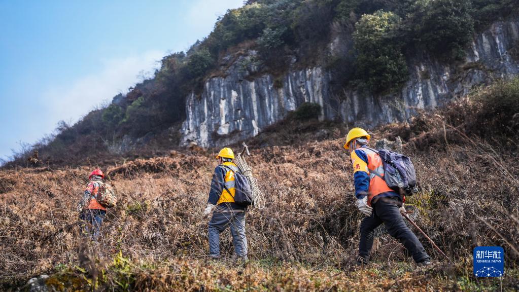 六盤水工電段職工在滬昆鐵路茨沖至濫壩區段登山巡檢(2月8日攝)。