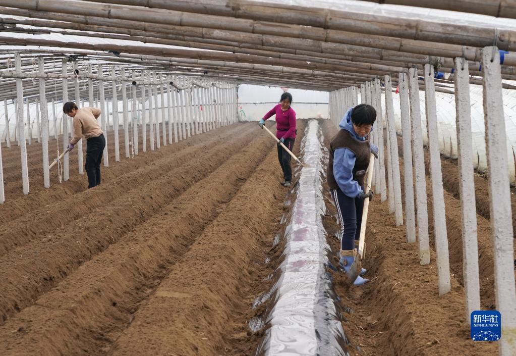 2月8日,河北省秦皇島市昌黎縣馬坨店鄉(xiāng)東趙莊村的農民在大棚內給剛播種的馬鈴薯覆膜。