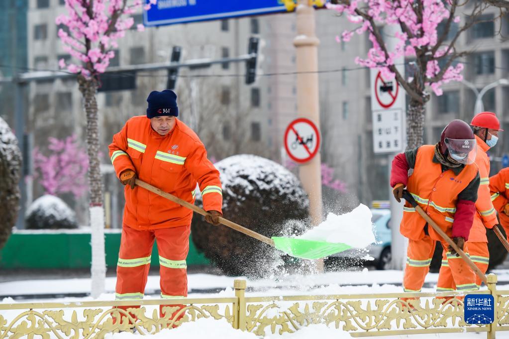 當日,內蒙古鄂爾多斯市迎來降雪天氣,路面出現積雪。當地環衛部門組織人力和大型機械清掃路面,保障市民出行安全。