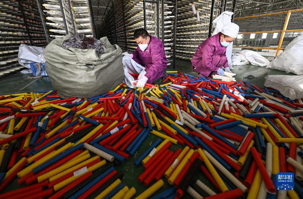 兩位員工在圣源地毯集團(tuán)有限公司生產(chǎn)車間內(nèi)分揀回收紗線筒(2月1日攝)。