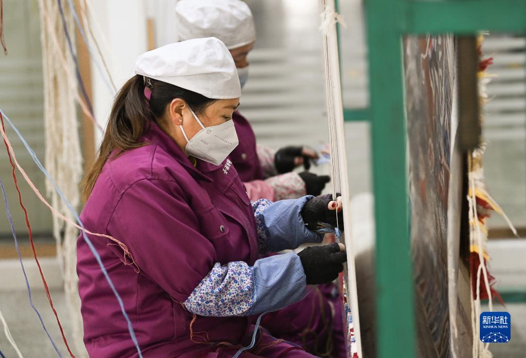 來自工廠附近湟中區(qū)東臺村的村民莫秀英(前)和工友在圣源地毯集團(tuán)有限公司生產(chǎn)車間手工編織地毯(2月1日攝)。