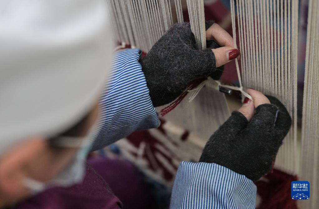 一位女工在圣源地毯集團有限公司生產車間手工編織地毯(2月4日攝)。
