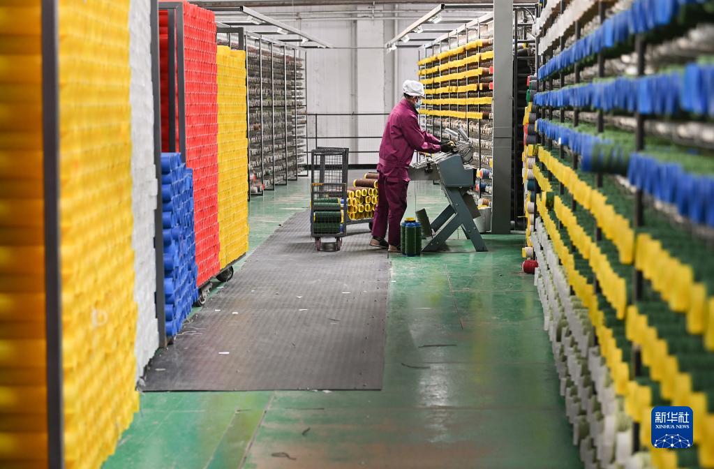 一位女工在圣源地毯集團有限公司生產車間檢查紗線筒(2月1日攝)。