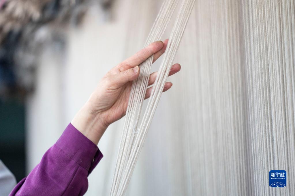 在青海省西寧市圣源地毯集團有限公司生產車間,操作工在梳理紗線(2月1日攝)。