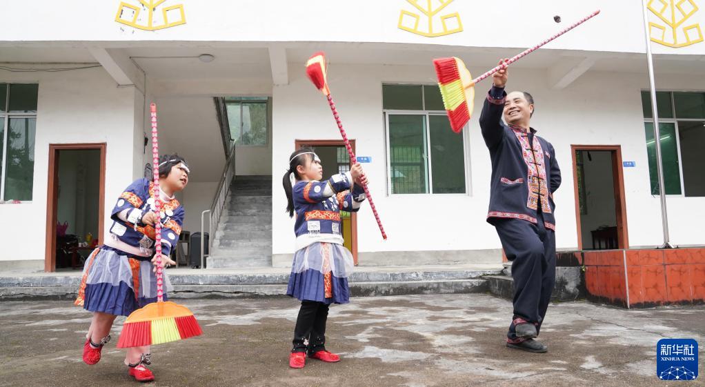 2月8日,鄧煙發在校內用掃帚代替花棍,教孩子跳瑤族傳統舞蹈——花棍舞。