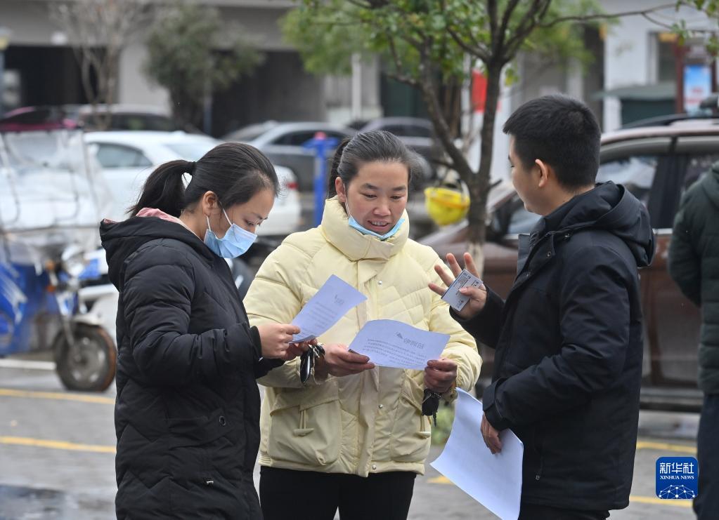 2月9日,在廣西融水苗族自治縣易地扶貧安置點苗美家園社區,求職者和招聘人員在交流。