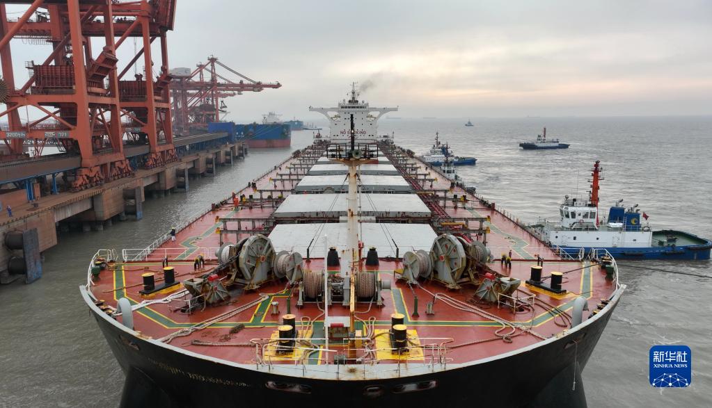 2月9日,一艘輪船在拖輪協(xié)助下向唐山港曹妃甸港區(qū)礦石碼頭靠泊(無(wú)人機(jī)照片)。