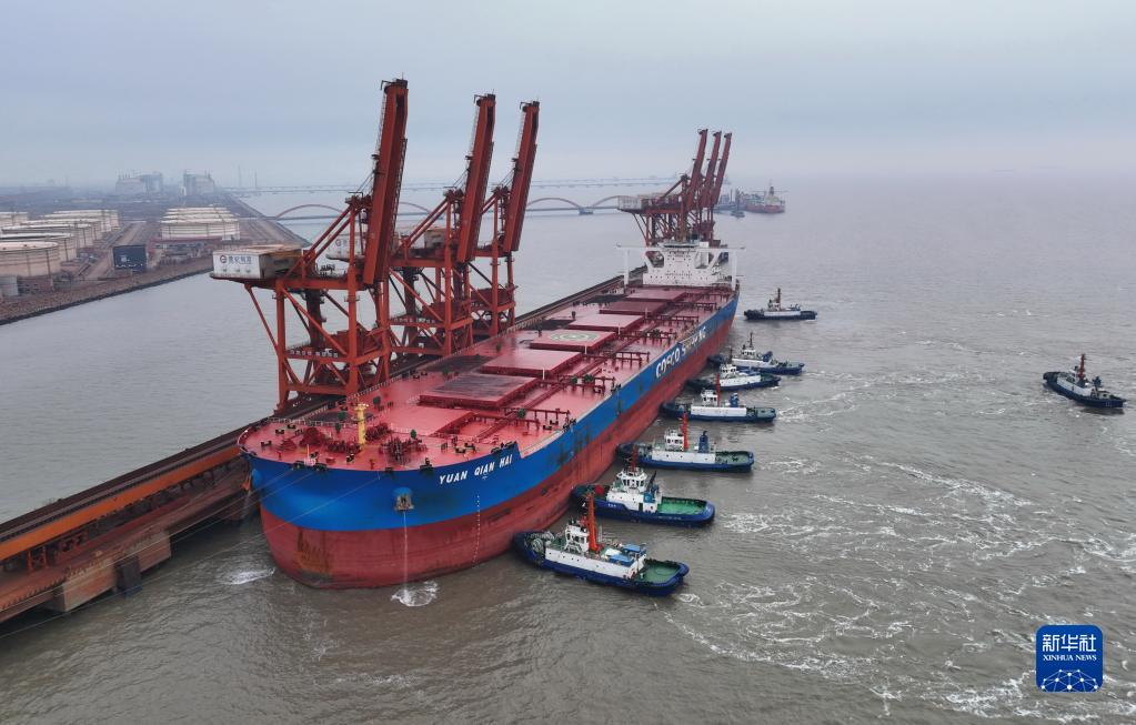 2月9日,一艘輪船在唐山港曹妃甸港區(qū)礦石碼頭卸載后準(zhǔn)備離港(無人機(jī)照片)。