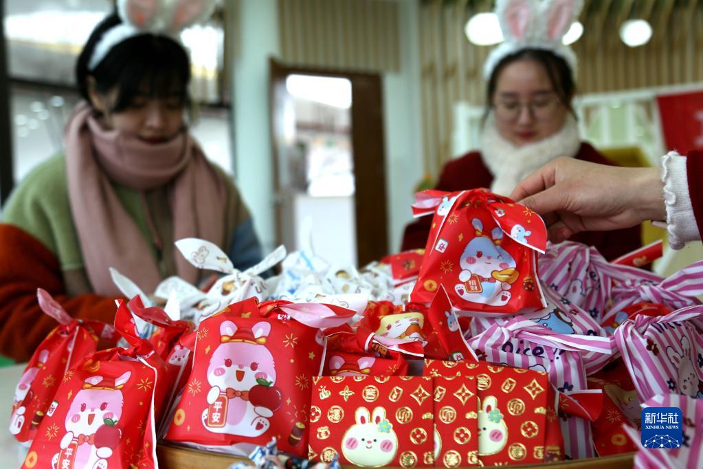 2月9日,福建武夷山百花幼兒園的老師們為孩子們準備兔年福袋。