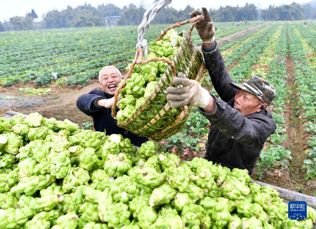 2月9日,四川省廣安市廣安區(qū)花橋鎮(zhèn)竹林村的農(nóng)民將砍收的青菜頭裝車。