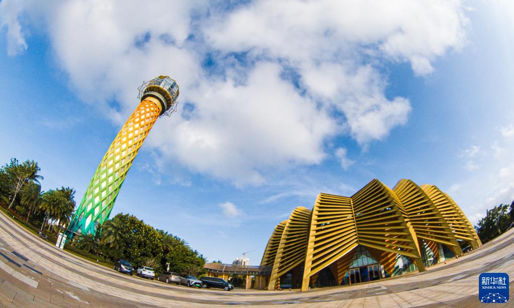 2月8日拍攝的海南自貿港重點園區——海口江東新區標志性建筑江東塔和江東新區展示中心(全景相機拍攝)。