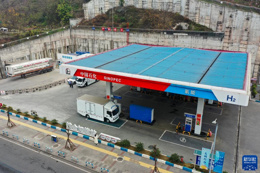 2月8日,在位于九龍坡區的重慶首座加氫站內,一輛慶鈴汽車(集團)有限公司生產的氫動力商用車正在加氫(無人機照片)。