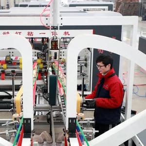 2月9日,在滄州市東光縣一紙箱機(jī)械公司,工作人員在組裝全自動粘箱設(shè)備。