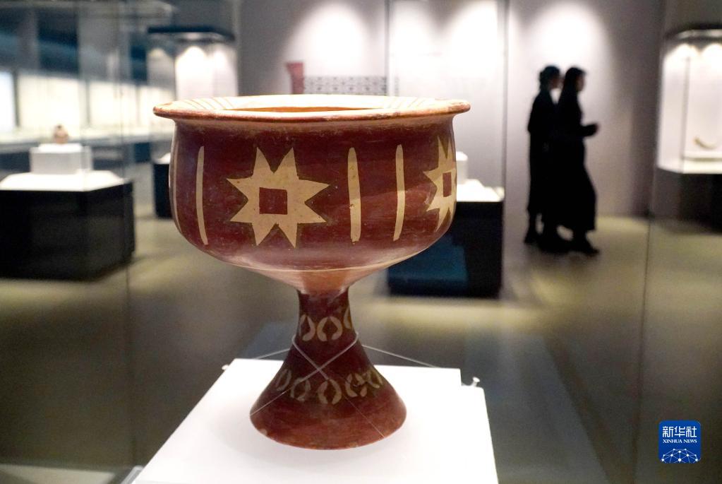 2月9日,在孔子博物館舉行的山東文物精品展上拍攝的山東省文物考古研究院收藏的大汶口文化八角星紋彩陶豆。