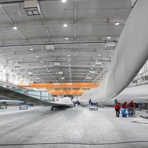 2月9日,在內蒙古烏蘭察布市遠景北方能源有限公司,質檢員在風機葉片生產線上工作。