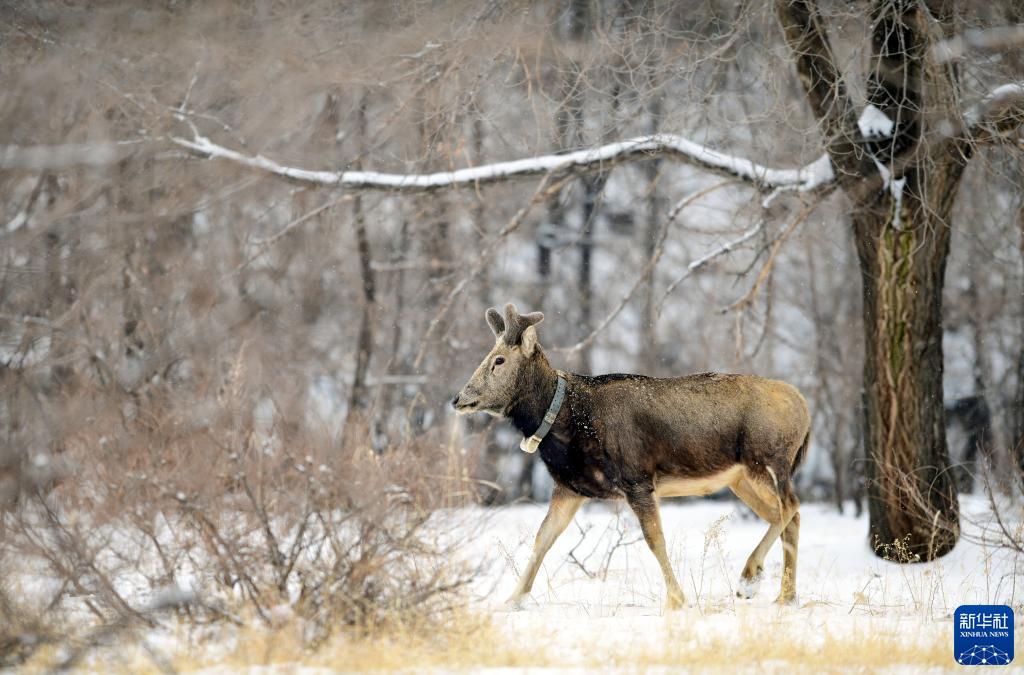 當日,內蒙古大青山國家級自然保護區迎來降雪,放歸于此的麋鹿在雪地上奔跑、嬉戲,構成一幅別樣的生態畫卷。