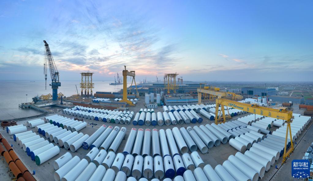 等待交付的海上風電場風機塔筒(2月7日攝,無人機照片)。
