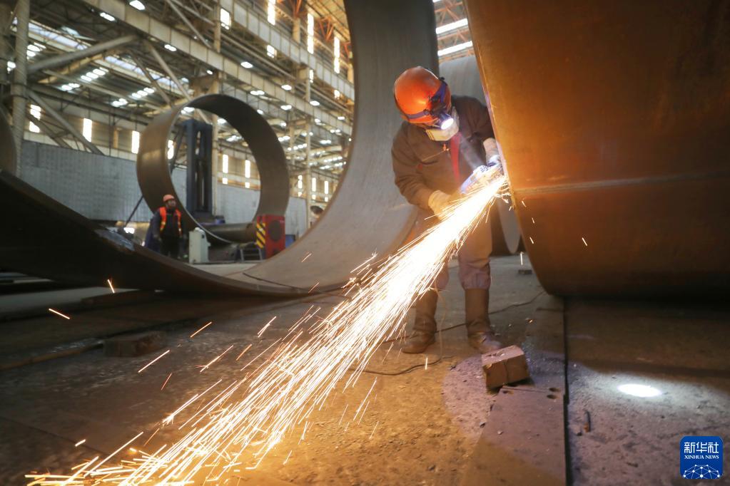 在位于江蘇省啟東市的一生產車間內,工人在進行塔節打磨作業(2月7日攝)。