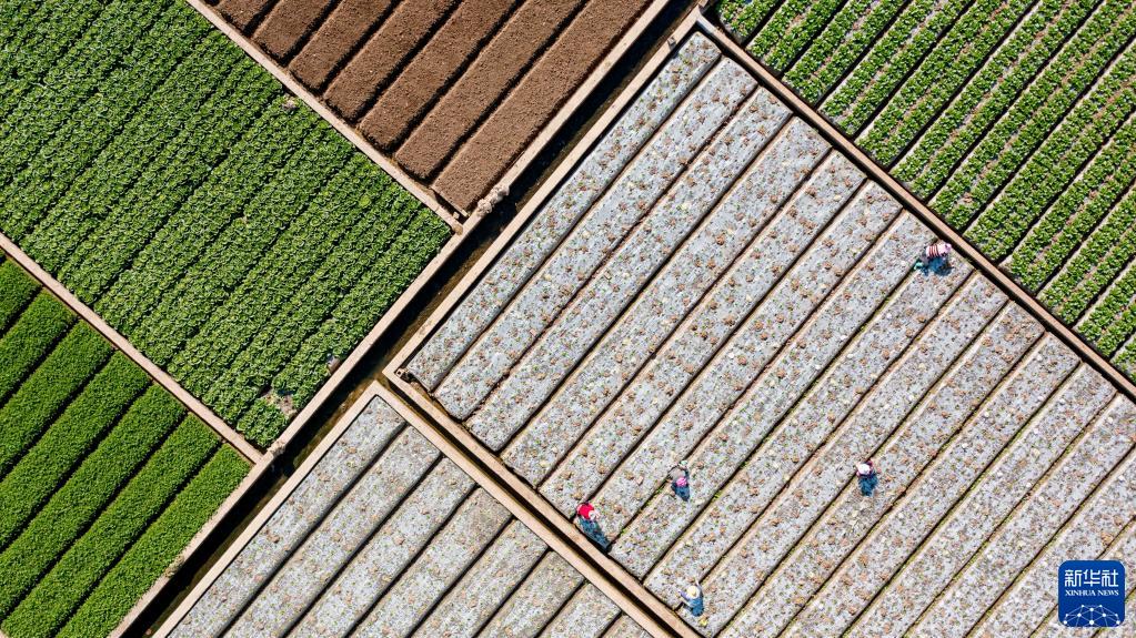 2月9日,在云南省玉溪市通海縣秀山街道,農民在田間勞作(無人機照片)。