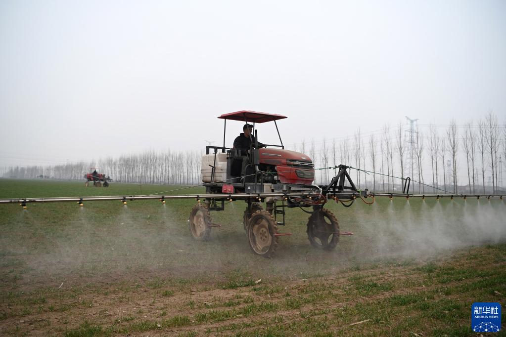 2月8日,在河南省沁陽市西萬鎮邘邰村,農民駕駛農機在麥田作業。