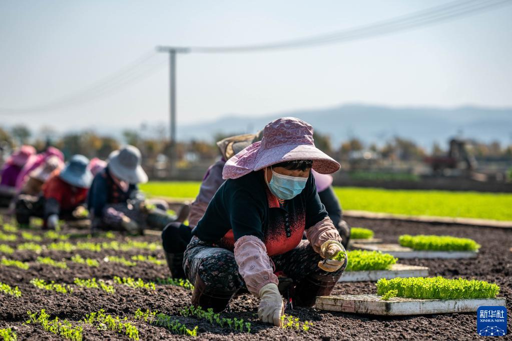 2月9日,在云南省玉溪市通??h秀山街道,農(nóng)民在種植芹菜。