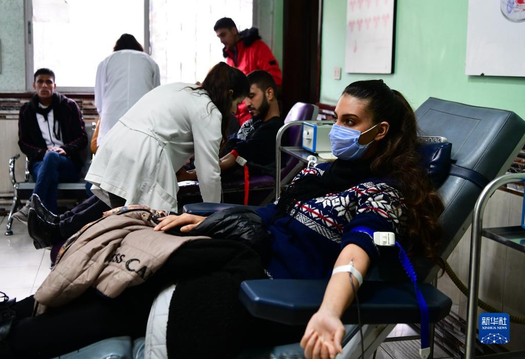 2月8日,民眾在敘利亞首都大馬士革一處獻血中心獻血。