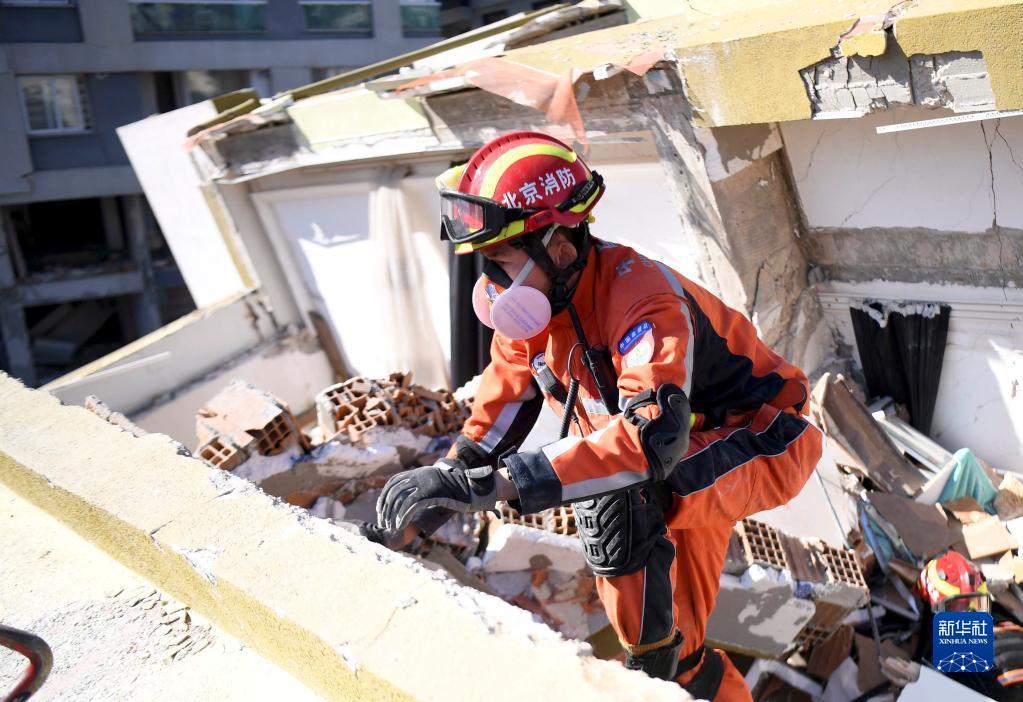 2月9日,中國救援隊(duì)隊(duì)員在土耳其哈塔伊省安塔基亞市的受損建筑上開展救援工作。