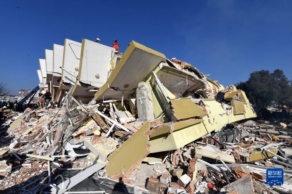 2月9日,中國救援隊隊員在土耳其哈塔伊省安塔基亞市的受損建筑上開展救援工作。