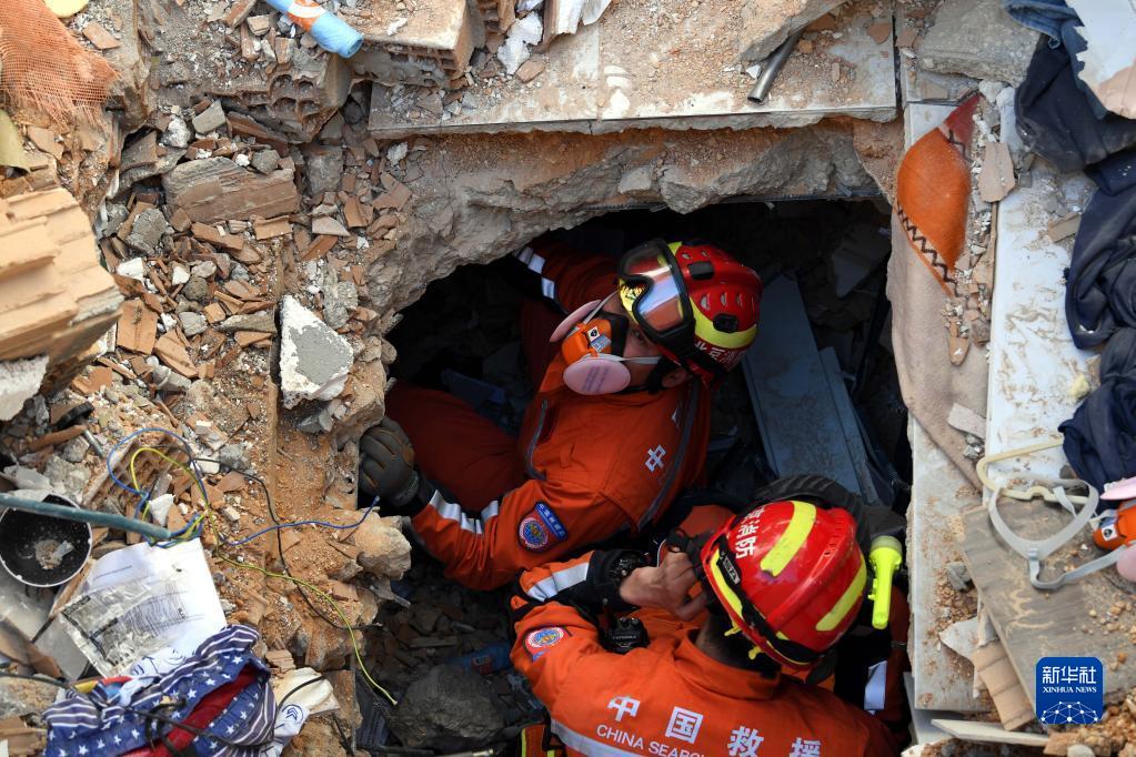 2月9日,中國救援隊隊員在土耳其哈塔伊省安塔基亞市深入受損建筑開展救援工作。
